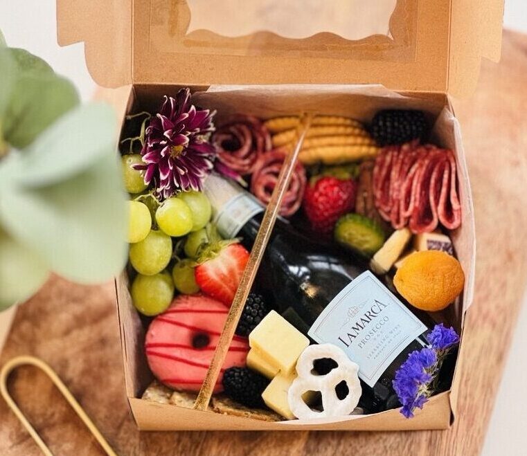 Serves 1–2 guests. An intimate grazing experience presented in a 6″ × 6″ box, including a mini sparkling wine, 2–3 artisanal cheeses, 2 premium cured meats, fresh and dried fruits, sweet elements, honey or preserves, crackers, and nuts.