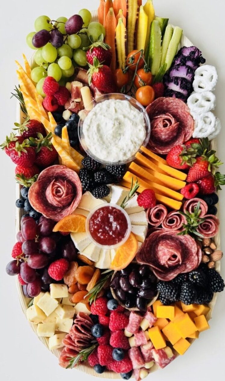 Serves 12–16 guests. A signature, elevated grazing experience styled on an oval 12″ × 22″ bamboo tray, showcasing 5–6 artisanal cheeses, 3–4 premium cured meats, seasonal fruits, olives, pickles, crisp crudités with hummus, crackers, nuts, and sweet elements.