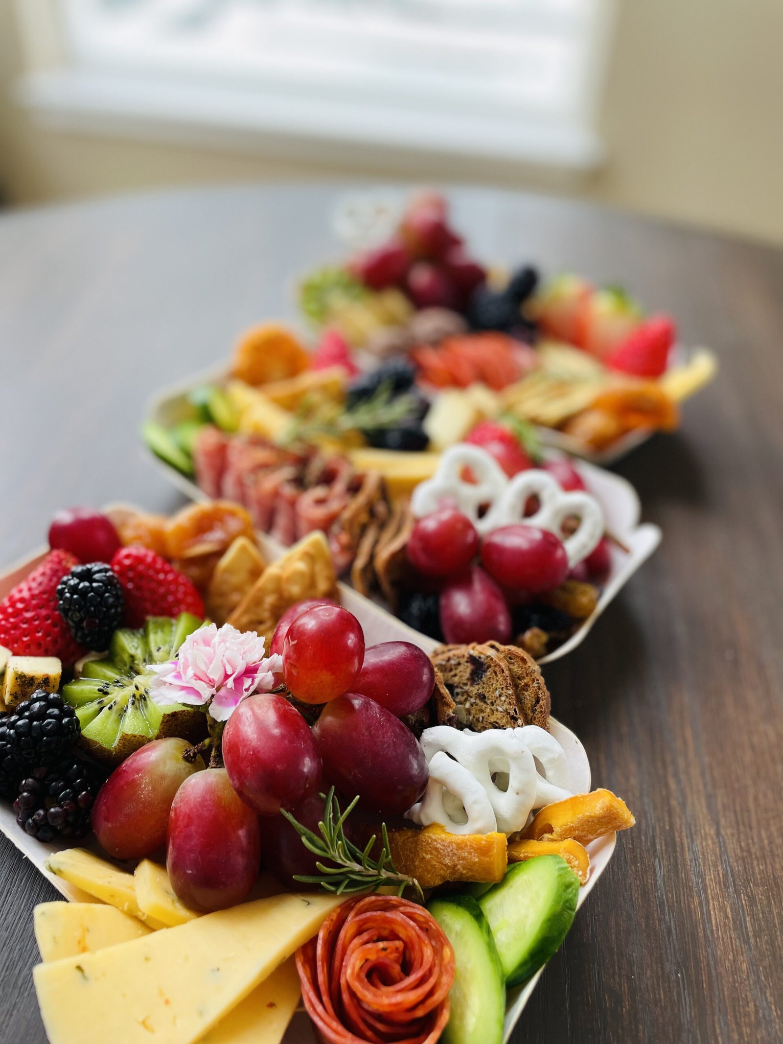 Personal size( 4”*8” bamboo tray), contains 2 cheeses, 1 meat, fresh and dried fruits, crackers, nuts, chocolate – minimum 10 orders